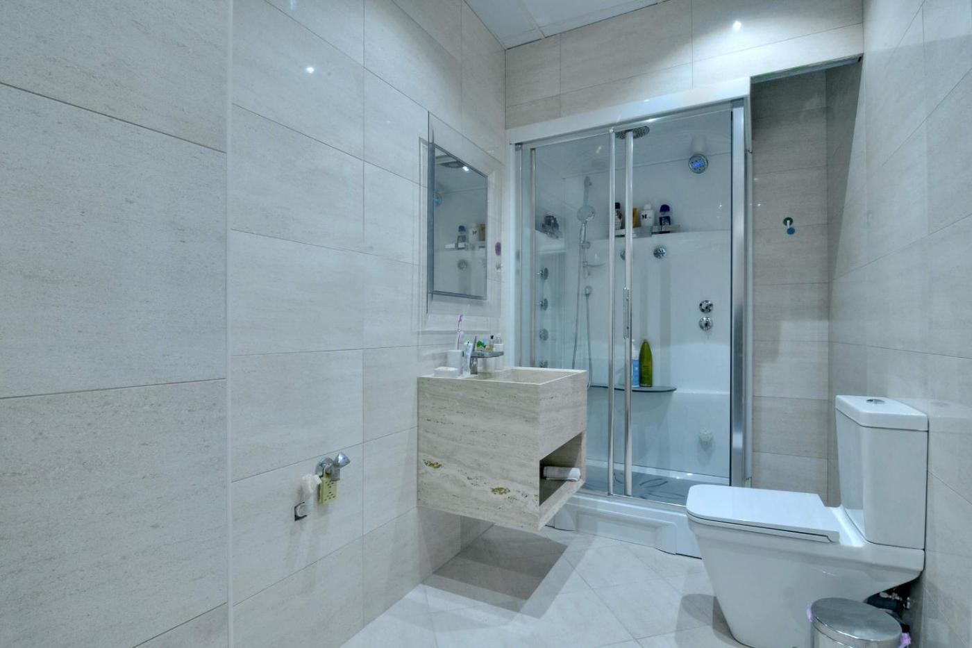 Three-Bedroom Apartment. This luxurious apartment features a hot tub, a sauna and a fireplace. Boasting a private entrance, this air-conditioned apartment includes 1 living room, 3 separate bedrooms and 1 bathroom with a bath and a shower. The fully equipped kitchen has a stovetop, a refrigerator, kitchenware and an oven. The spacious apartment offers a flat-screen TV, a washing machine, soundproof walls, a minibar as well as city views. The unit has 3 beds.