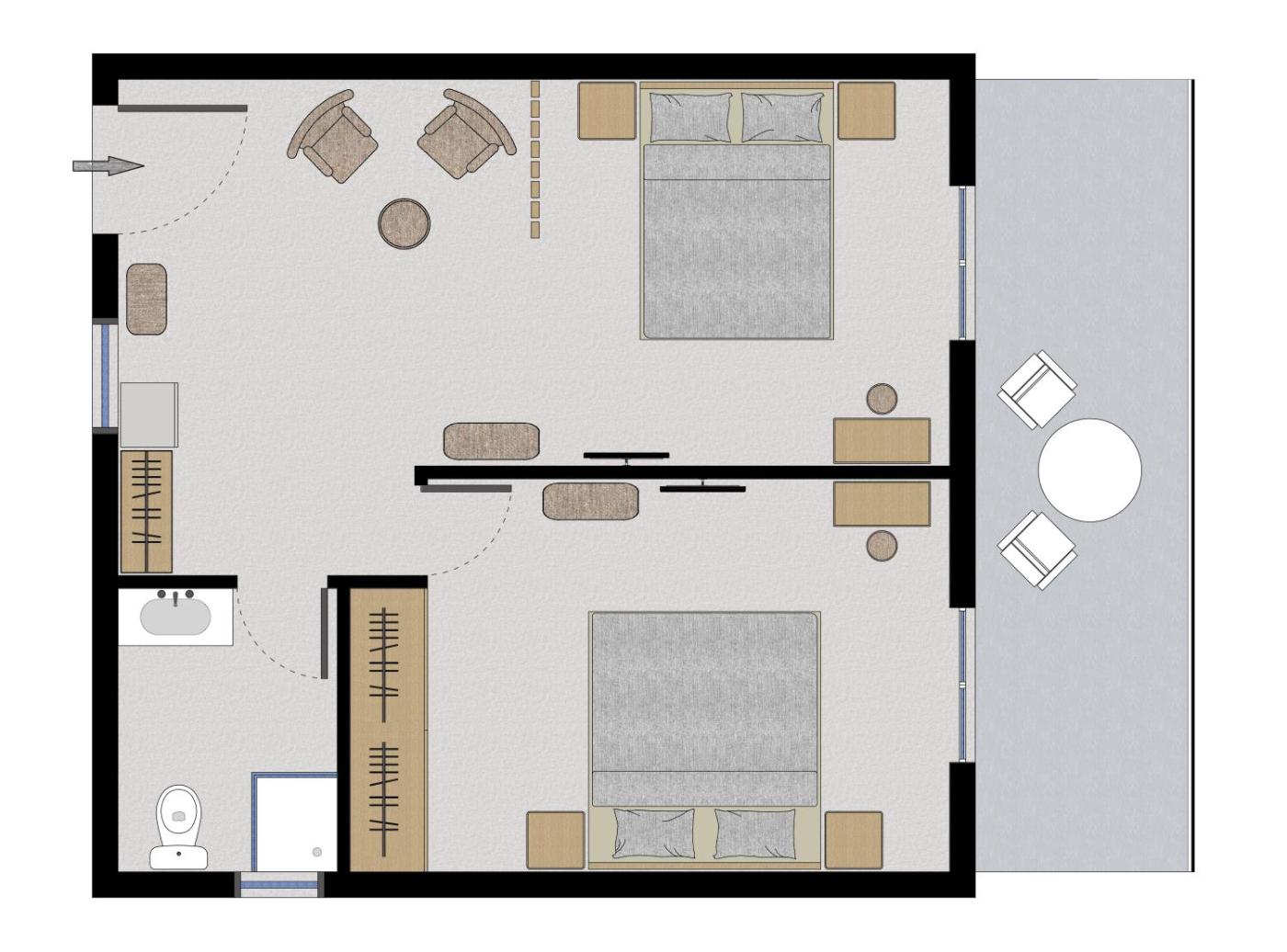 Family Room with Balcony. Featuring a balcony with garden, pool or sea views, this apartment consists of 2 separate rooms. It has a fully equipped kitchenette with a fridge, electric oven and cooking hobs. The bathroom is fitted with a bathtub. A fan and safe are available upon request with surcharge. ;